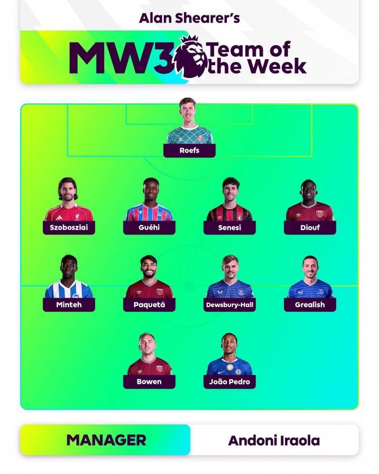直播吧9月3日讯 英格兰足坛名宿希勒评出了英超第三轮比赛最佳阵容,若昂-佩德罗、索博斯洛伊、鲍文、格拉利什在列。